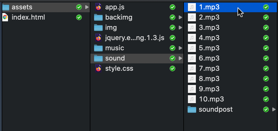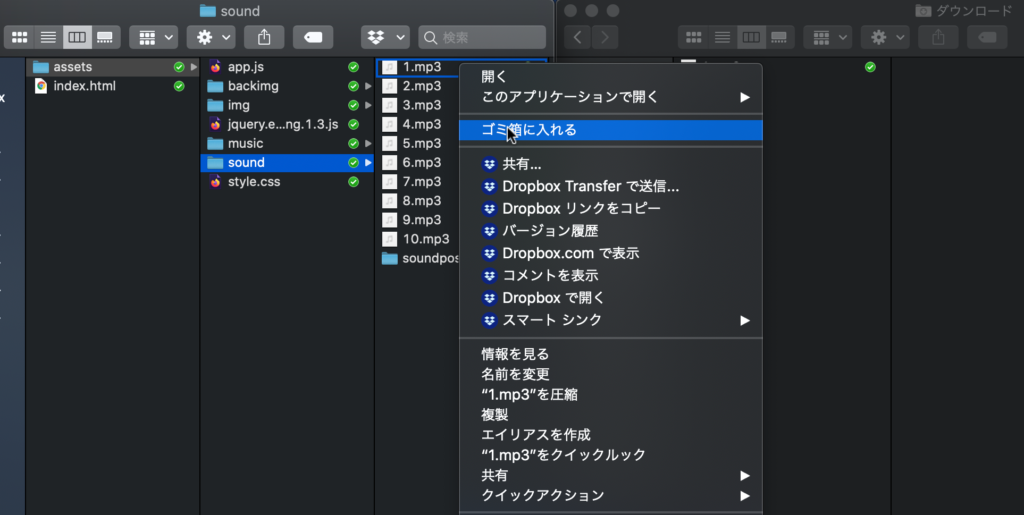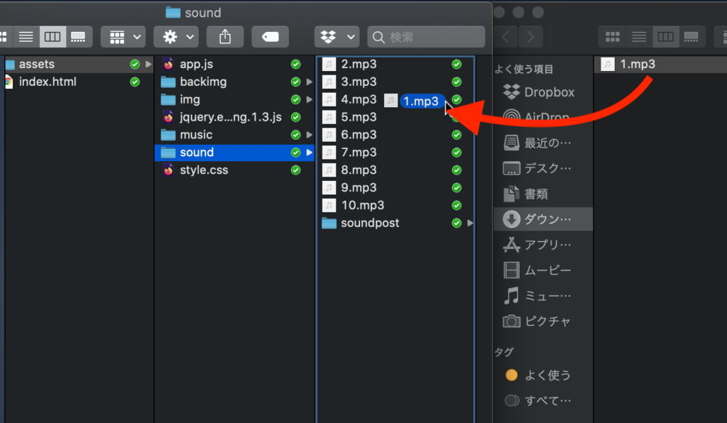 「1.mp3」を長押ししながらassets/soundの中に入れて離します。